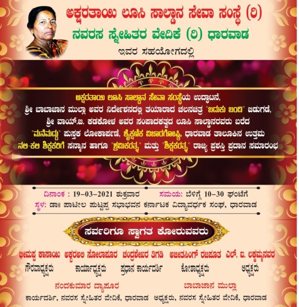 ಇದೇ ಮಾರ್ಚ 19 ರಂದು ಧಾರವಾಡದ ಕರ್ನಾಟಕ ವಿದ್ಯಾವರ್ಧಕ ಸಂಘದ ಡಾ.ಪಾಟೀಲ ಪುಟ್ಟಪ್ಪ ಸಭಾಭವನದಲ್ಲಿ ಬದುಕು ಬಂಡಿ ಚಲನಚಿತ್ರ ಪ್ರೋಮೋ ಮತ್ತು ಶ್ರೀ ವೈ.ಬಿ.ಕಡಕೋಳರ ಸಂಪಾದಕತ್ವದ ಮನೆಮದ್ದು ಕೃತಿ ಲೋಕರ್ಪಾಣೆಗೊಳ್ಳಲಿದೆ. ಈ ಚಲನಚಿತ್ರ ಬಿಡುಗಡೆಯನ್ನು ಸನ್ಮಾನ್ಯ ಶಿಕ್ಷಣ ಸಚಿವರಾದ ಶ್ರೀ ಸುರೇಶ ಕುಮಾರ್ ನೆರವೇರಿಸಲಿದ್ದು ಕಾರ್ಯಕ್ರಮದ ಉದ್ಘಾಟನೆಯನ್ನು ವಿಧಾನಸಭಾ ಸಭಾಪತಿಗಳಾದ ಶ್ರೀ ಬಸವರಾಜ ಹೊರಟ್ಟಿಯವರು ನೆರವೇರಿಸುವರು. ಮನೆಮದ್ದು ಪುಸ್ತಕ ಲೋಕಾರ್ಪಣೆಯನ್ನು ಧಾರವಾಡ ಗ್ರಾಮೀಣ ಶಾಸಕರಾದ ಶ್ರೀ ಅಮೃತ ದೇಸಾಯಿ ನೆರವೇರಿಸಲಿರುವರು.