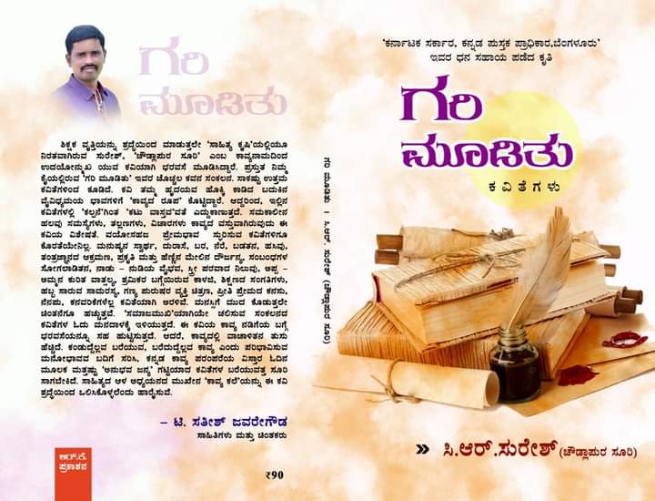 ಶ್ರೀ ಸುರೇಶ್. ಸಿ.ಆರ್, ಅವರು ಬಳ್ಳಾರಿ ಜಿಲ್ಲೆಯ ಸಿರುಗುಪ್ಪ ತಾಲೂಕಿನ ಕೋಟೆಹಾಳು ಸರ್ಕಾರಿ ಕಿರಿಯ ಪ್ರಾಥಮಿಕ ಶಾಲೆಯಲ್ಲಿ ಶಿಕ್ಷಕರಾಗಿ ಕೆಲಸ ಮಾಡುತ್ತಾ ವಿದ್ಯಾರ್ಥಿಗಳ ಮೆಚ್ಚುಗೆಯನ್ನು ಗಳಿಸಿಕೊಂಡು ಅನೇಕ ಪುರಸ್ಕಾರಗಳಿಗೆ ಭಾಜನರಾಗಿದ್ದಾರೆ. ಕನ್ನಡ ಸಾಹಿತ್ಯ ಸಾರಸ್ವತಲೋಕದಲ್ಲಿ ಕಥೆ, ನಾಟಕ, ವಿಮರ್ಶೆ,ಕಾದಂಬರಿ, ಕಾವ್ಯ ಮತ್ತು ಕವಿತೆ ಮೊದಲಾದ ಸಾಹಿತ್ಯ ಪ್ರಕಾರಗಳಿವೆ. ಇವು ತಮ್ಮ ವಿಶಿಷ್ಟ ಬರವಣಿಗೆಯ ಶೈಲಿಯಿಂದಲೇ ಸಹೃದಯರಿಗೆ ಪ್ರಿಯವಾದವು. ಕವಿಗಳು ಬರಹಗಾರನ ಅನುಭವ-ಅನುಭಾವಗಳನ್ನು ವೈಯಕ್ತಿಕ ವಾಗಿಯೂ, ಸಮುದಾಯಕವಾಗಿಯೂ ಅಭಿವ್ಯಕ್ತಪಡಿಸಬಲ್ಲ/ಪ್ರತಿನಿಧಿಸಲ್ಲ ಮಾಧ್ಯಮವಾಗಿವೆ. ಈ ಯುವ ಬರಹಗಾರ ತಮ್ಮ ಚೊಚ್ಚಲ ಕೃತಿಯಾದ “ ಗರಿ ಮೂಡಿತು ” ಕವನ ಸಂಕಲನದ ಮೂಲಕ ಉದಯೊನ್ಮುಖ ಭರವಸೆಯ ಕವಿಯಾಗಿ ಕನ್ನಡ ಸಾರಸತ್ವ ಲೋಕಕ್ಕೆ ಸೇರ್ಪಡೆ ಗೊಳ್ಳುತ್ತಿರುವುದು ಸಂತಸದ ವಿಷಯ.