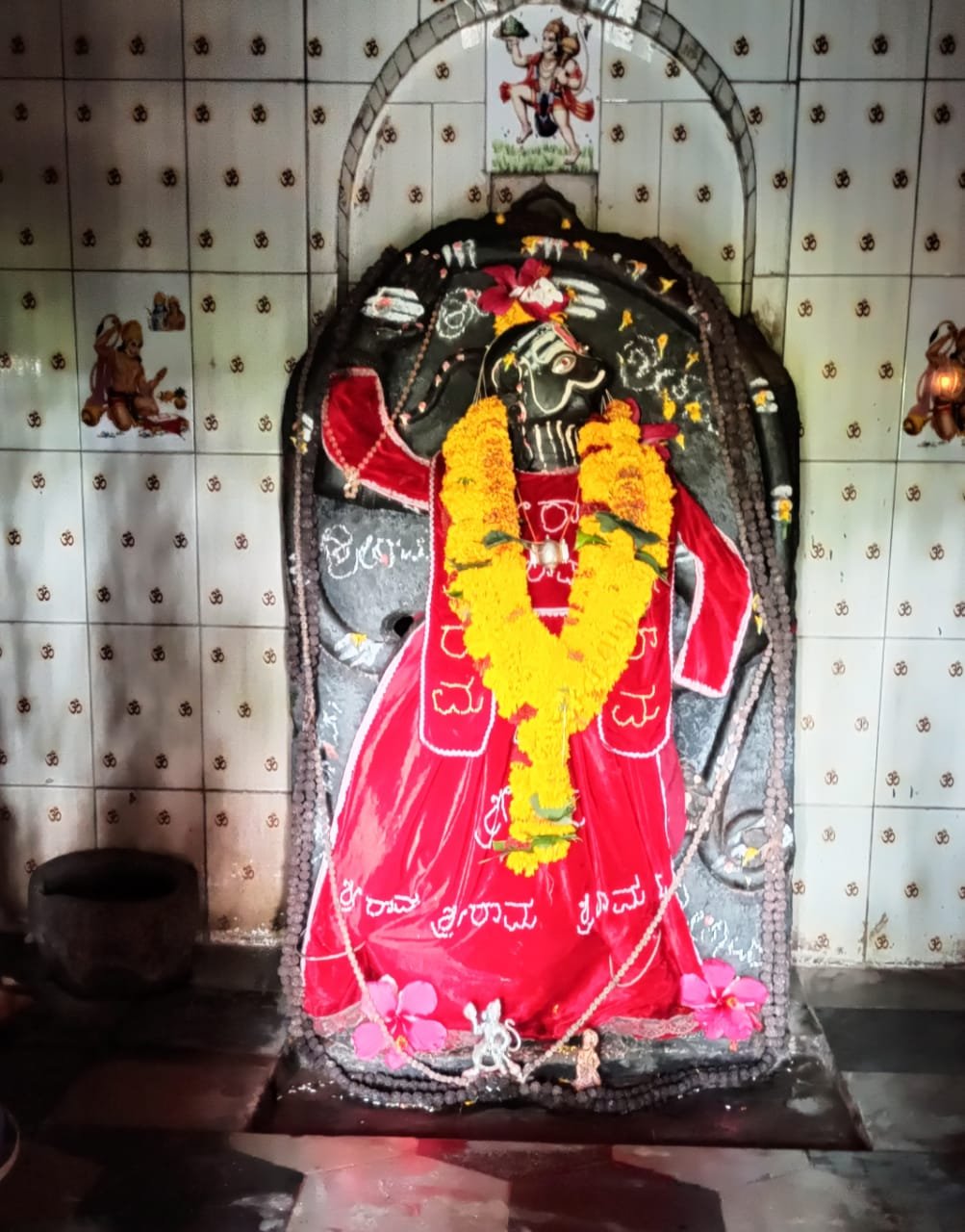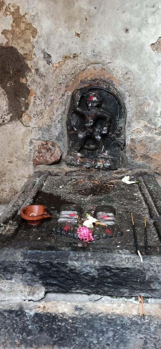 ಅಲ್ಲಿ ಎರಡು ವಿಗ್ರಹಗಳನ್ನು ಗಮನಿಸಿದಾಗ ಒಂದು ಬಿಳಿ ಶಿಲೆಯಲ್ಲಿದ್ದರೆ ಇನ್ನೊಂದು ಕಪ್ಪು ಶಿಲೆಯಲ್ಲಿದೆ. ಒಂದು ಎತ್ತರದ ಮೂರ್ತಿ ಇನ್ನೊಂದು ಪುಟ್ಟ ವಿಗ್ರಹ.ಪುಟ್ಟ ವಿಗ್ರಹದ ಮುಂದೆ ಪಾದಗಳಿವೆ.ಇವೆರಡೂ ವಿಗ್ರಹಗಳ ಬಾಲದಲ್ಲಿ ಗಂಟೆ ಇರುವುದು ವಿಶೇಷ.