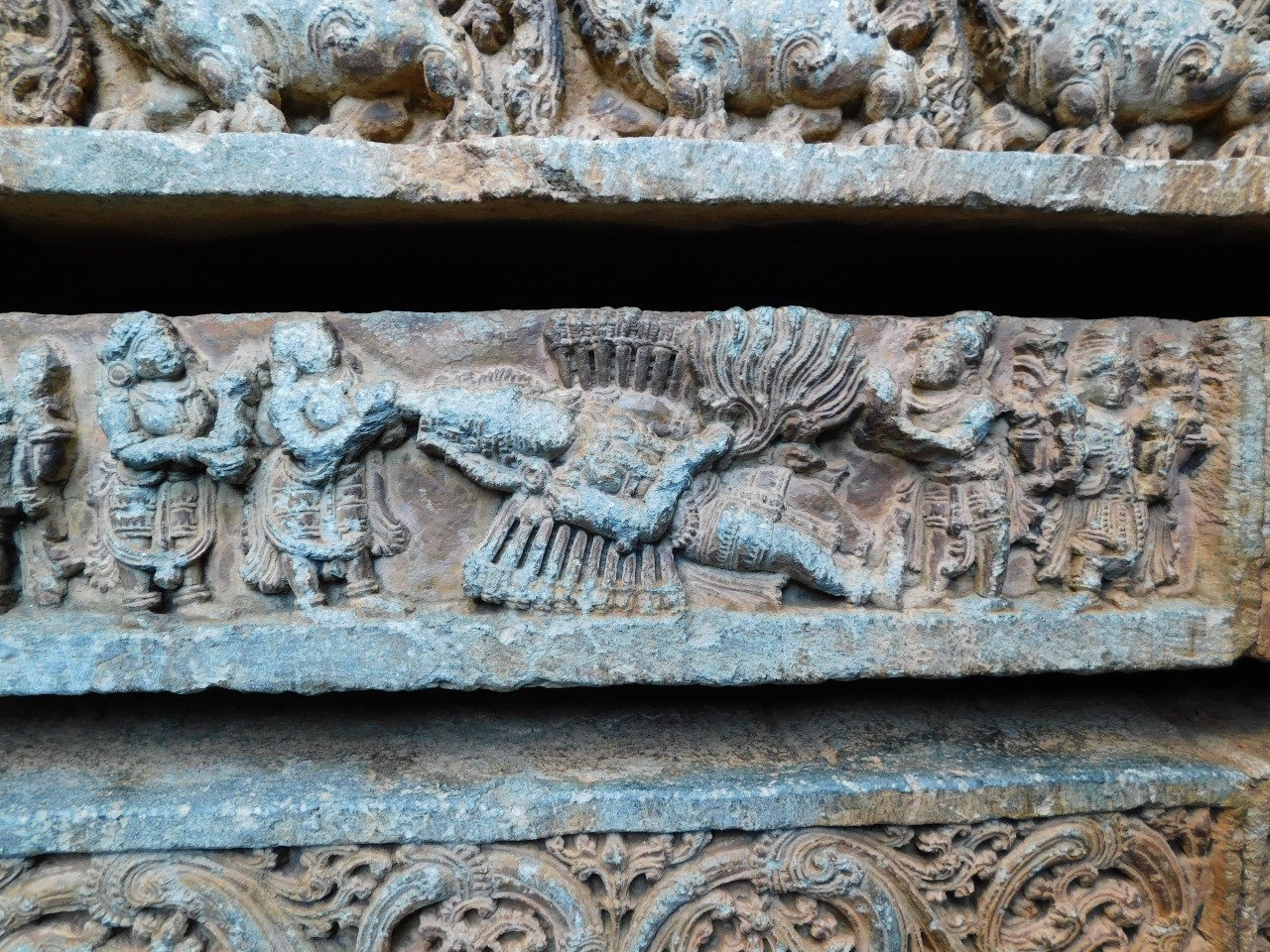 ನಂತರದ ಸಾಲಿನಲ್ಲಿ ಪೌರಾಣಿಕ ಕೆತ್ತೆನೆ ಇದ್ದು,  ರಾಮಾಯಣ,  ಮಹಾಭಾರತ, ಭಾಗವತ ಮತ್ತು ದಶಾವಾತದರ ದೊಡ್ಡ ಸುಂದರ ಶಿಲ್ಪ ಗಳಿವೆ.ಈಕೆತ್ತೆನೆಗಳು ದೇವಾಲಯಕ್ಕೆಮುಕುಟ ಪ್ರಾಯ.ಇಲ್ಲಿ ಪ್ರಮುಖವಾಗಿ ಸಮುದ್ರಮಥನ ಹಿರಣ್ಯ ಕಶುಪವಿನ ಸಂಹಾರ, ಗಜಾಸುರನ ಸಂಹಾರ, ರಾಮಯಣದಲ್ಲಿ ಪುತ್ರಕಾಮೇಷ್ಟಿ ಯಾಗ, ಸೀತೆಯ ಜನನ, ಸೀತಾ ಕಲ್ಯಾಣ, ರಾಮನ ಅರಣ್ಯವಾಸಕ್ಕೆ ಹೋಗುವುದು, ಶೂರ್ಪನಖಿ ನಾಸಿಕ ಬೇದ, ಸೀತಾಪಾರಹಣ, ವಾಲಿ,ಇನ್ನುಮಹಾಭಾರತದಲ್ಲಿ ಪಗಡೆಯಾಟ ಅಜ್ಞಾತವಾಸ, ಕೀಚಕವಧೆ, ಯುದ್ದ ಸನ್ನಿವೇಷ ಗಳು, (ಚಕ್ರವ್ಯೂಹ, ಗಧಾಯುದ್ದ ಹಾಗೂ ಕರ್ಣಾರ್ಜುನ ಕಾಳಗ) ಪಟ್ಟಾಭಿಷೇಕ ನೋಡ ಬಹುದು. ಹಾಗೆಯೇ ಭಾಗವತದ ಸಂಪೂರ್ಣ ಕಥನ ನೋಡಬಹುದು.ಸುಗ್ರೀವ ಯುದ್ದ, ಹನುಮಂತನ ಲಂಕಾ ಭೇಟಿ, ರಾಮಸೇತು ನಿರ್ಮಾಣ,ಯುದ್ದ,ಪಟ್ಟಾಭಿಷೇಕ,ಅಗ್ನಿಪರೀಕ್ಷೆ ನೋಡಬಹುದು.