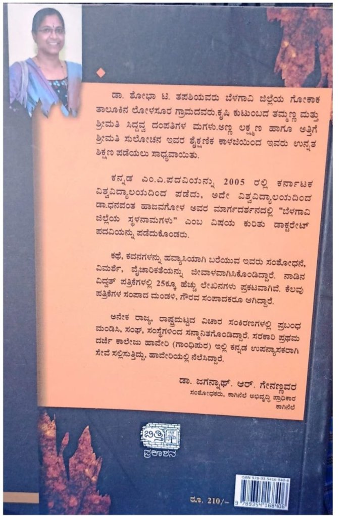 ಬೆಳಗಾವಿಜಿಲ್ಲೆಯ ಸ್ಥಳನಾಮಗಳುಡಾ.ಶೋಭಾ ತಪಸಿಯವರ‘ಬೆಳಗಾವಿ ಜಿಲ್ಲೆಯ ಸ್ಥಳನಾಮ ಗಳು’ ಸಂಶೋಧನಾ ಮಹಾಪ್ರಬಂಧ. ಇದು ಒಟ್ಟು 292 ಪುಟಗಳ ಹರವನ್ನು ಒಳಗೊಂಡಿದೆ. ಡಾ.ಧನವಂತ ಹಾಜವ್ವಗೋಳ ಅವರ ಮುನ್ನುಡಿ ಯ ಮಹತ್ವದ ಬಹುತೇಕ ಸಂಗತಿಗಳನ್ನು ನಾನಿಲ್ಲಿ ಉಲ್ಲೇಖಿಸಿರುವೆನು. ಡಾ.ಶೋಭಾ ತಪಸಿ ಅವರು ತುಂಬಾ ಶ್ರಮವಹಿಸಿ ಕ್ಷೇತ್ರಕಾರ್ಯವನ್ನು ಮಾಡಿ, ಈ ಮೌಲಿಕವಾದ ಮಹಾಪ್ರಬಂಧವನ್ನು ರಚಿಸಿ ದ್ದಾರೆ. `ಬೆಳಗಾವಿ ಜಿಲ್ಲೆಯ ಸ್ಥಳನಾಮಗಳು’ ಎಂಬ ಸಂಶೋಧನಾ ಮಹಾಪ್ರಬಂಧದಲ್ಲಿ ಒಟ್ಟು ಏಳು ಅಧ್ಯಾಯಗಳಿವೆ.
