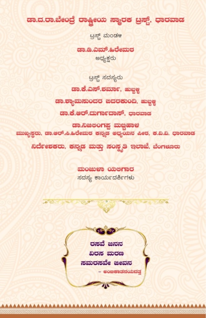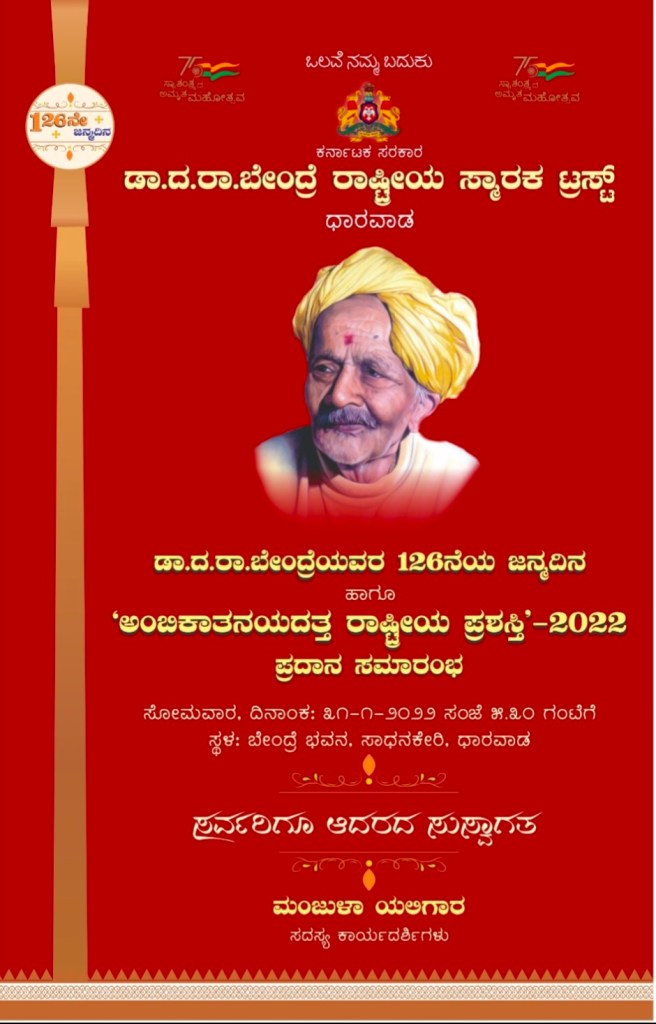 ಶಬ್ದಗಾರುಡಿಗ,ವರಕವಿ,ಜ್ಞಾನಪೀಠ ಪ್ರಶಸ್ತಿ ವಿಜೇತ ಡಾ.ದ.ರಾ.ಬೇಂದ್ರೆಯವರ ೧೨೬ ನೇ ಜನ್ಮ ದಿನವನ್ನು ಇಂದು ಡಾ.ದ.ರಾ.ಬೇಂದ್ರೆ ರಾಷ್ಟ್ರೀಯ ಸ್ಮಾರಕ ಟ್ರಸ್ಟ್,ಧಾರವಾಡ ಇದರ ವತಿಯಿಂದ ಸಾಧನಕೇರಿ ಯ ಬೇಂದ್ರೆ ಭವನದಲ್ಲಿ ಆಚರಿಸಲಾಗುತ್ತಿದ್ದೆ. ಜನನ: ೩೧/೦೧/೧೮೯೬. ಮರಣ:೨೬/೧೦/೧೯೮೧
