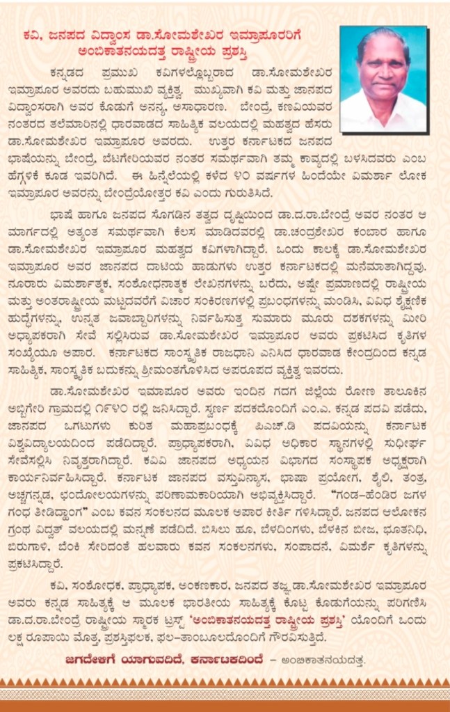 ಇದೇ ಸಂದರ್ಭದಲ್ಲಿ ಹಿರಿಯ ಜಾನಪದ ತಜ್ಞ ಡಾ.ಸೋಮಶೇಖರ ಇಮ್ರಾಪುರ ಇವರಿಗೆ ಅಂಬಿಕಾತನಯದತ್ತ ರಾಷ್ಟ್ರೀಯ ಪ್ರಶಸ್ತಿಯನ್ನು ನೀಡಿ ಗೌರವಿಸಲಾಗುತ್ತಿದೆ. ತಮ್ಮ ಕಾವ್ಯಗಳಲ್ಲಿ ಜಾನಪದ ಸೊಗಡನ್ನು ತುಂಬಿ ಕಾವ್ಯ ರಚಿಸಿದ ಅಂಬಿಕಾತನಯ ದತ್ತರ ಹೆಸರಿನ ರಾಷ್ಟ್ರೀಯ ಪ್ರಶಸ್ತಿಯನ್ನು ತಮ್ಮ ಜಾನಪದ ಸಾಹಿತ್ಯದಿಂದ ರಸಿಕರ ಹೃದಯ ಗೆದ್ದಿರುವ ಡಾ.ಸೋಮಶೇಖರ ಇಮ್ರಾಪೂರ ಇವರಿಗೆ ನೀಡುತ್ತಿ ರುವುದು ಹೆಚ್ಚು ಅರ್ಥಪೂರ್ಣವಾಗಿದೆ.