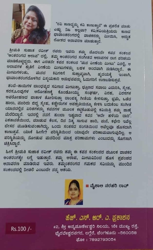 ಶ್ರೀಮತಿ ಸುಜಾತ ರವೀಶ್ ರವರ ಮೊದಲನೇ ಕವನ ಸಂಕಲನ “ಅಂತರಂಗದ ಆಲಾಪ”. ಎರಡನೇ ಕವನ ಸಂಕಲನ “ಮನವೀಣೆಯ ಮೀಟು”. ಎರಡೂ ಕವನ ಸಂಕಲನಗಳು ಸಂಗೀತದ ಪ್ರಭಾವಳಿಯೊಳಗೆ ಮೆರೆಯುತ್ತಿವೆ.