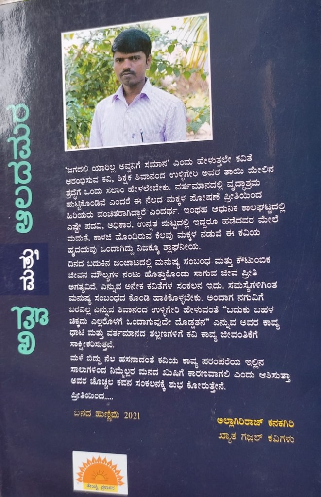 “ಮಳೆ ಬಿದ್ದು ನೆಲ ಹಸನಾದಂತೆ ಕವಿಯ ಕಾವ್ಯ ಪರಂಪರೆಯ ಇಲ್ಲಿನ ಸಾಲುಗಳಿಂದ ನಿಮ್ಮೆಲ್ಲರ ಮನದ ಖುಷಿಗೆ ಕಾರಣವಾಗಲಿ, ಅವರ ಕವನ ಸಂಕಲನಕ್ಕೆ ಶುಭ ಕೋರುವೆ” ಎಂದು ಗಜಲ್ ಕವಿ ಅಲ್ಲಾಗಿರಿರಾಜ್ ತಮ್ಮ ಬೆನ್ನುಡಿಯಲ್ಲಿ ಹಾರೈಸಿರುವರು.