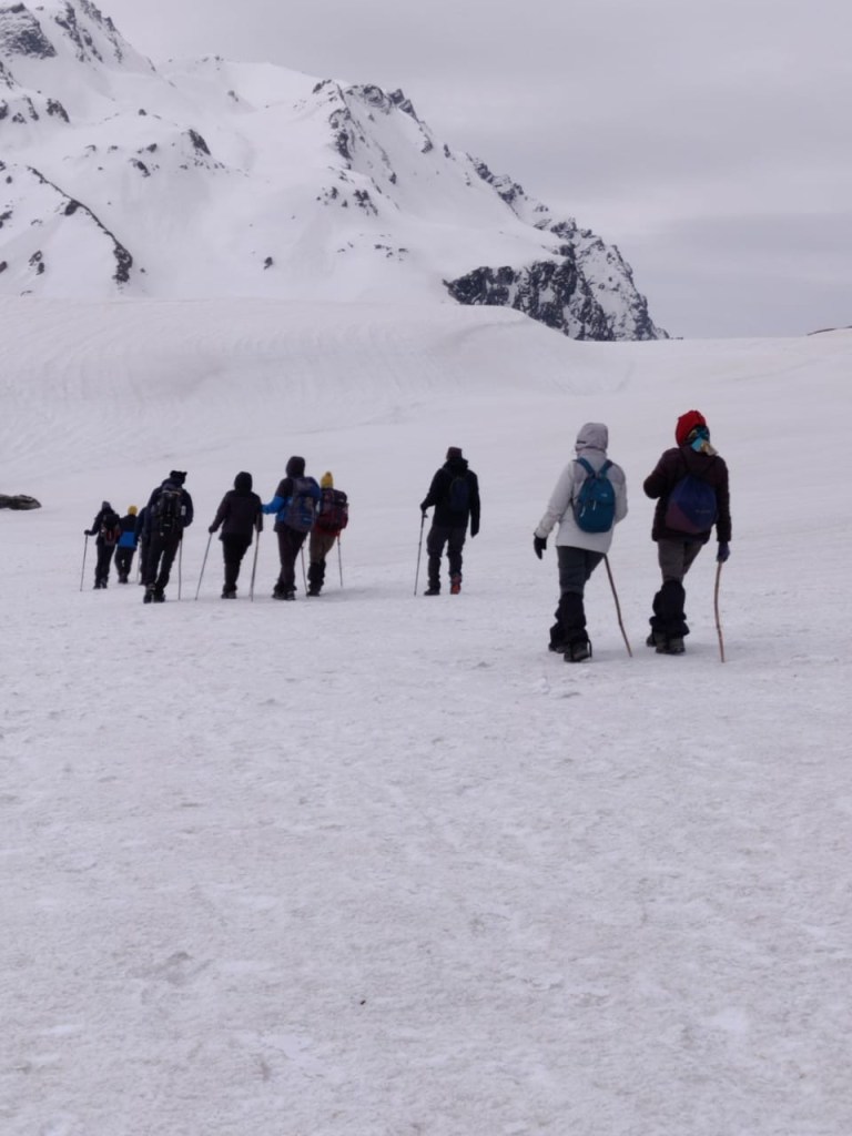 ೫ ನೇ ದಿನ ಬೆಳಿಗ್ಗೆ ೩ ಗಂಟೆಗೇ ಚಾರಣ ಶುರು…! ಸೂರ್ಯ ಮೂಡುವ ಮೊದಲೇ, ತಲೆಗೆ ಸಿಕ್ಕಿಸಿ ಕೊಂಡ ಟಾರ್ಚ್ ಬೆಳಕಲ್ಲಿ ಒಬ್ಬರ ಹಿಂದೆ ಒಬ್ಬರು, ನಿಧಾನವಾಗಿ ಹೆಜ್ಜೆಯ ಮೇಲೆ ಹೆಜ್ಜೆ ಇಟ್ಟು , ದುರ್ಗಮ ಇಳಿಜಾರಿನ ಹಿಮ ಪರ್ವತ ವನ್ನು ಏರುವುದು ಒಂದು ಸವಾಲೇ ಸರಿ. ಅಷ್ಟು ಬೆಳಿಗ್ಗೆ ಚಾರಣ ಶುರು ಮಾಡಲು ಕಾರಣವೂ ಇದೆ. ಸೂರ್ಯೋದ ಯದ ನಂತರ ಬಿಸಿಲಿಗೆ ಹಿಮದ ಮೇಲ್ಪದರ ಕರಗಿ ನೀರಾಗುತ್ತದೆ. ಅದರ ಮೇಲೆ ಹೆಜ್ಜೆಯಿಟ್ಟರೆ ಜಾರುವ ಸಂಭವ ಹೆಚ್ಚು. ಬೆಳಗಿನ ಜಾವ ಹಿಮ ಗಟ್ಟಿಯಾಗಿದ್ದು ನಮ್ಮ ಹೆಜ್ಜೆಗಳು ಹೆಚ್ಚು ಧೃಡವಾಗಿ ಹಿಮದಲ್ಲಿ ಕೂರುತ್ತವೆ. ಇದು ಚಾರಣಿಗರ ಸುರಕ್ಷತೆಯ ದೃಷ್ಟಿಯಿಂದ ತುಂಬಾ ಮುಖ್ಯ. ಈ ದಿನ ಎದುರಾದದ್ದು ಅತೀ ಹೆಚ್ಚಿನ ಶ್ರಮ ಹಾಗೂ ಮಾನಸಿಕ ಸ್ಥೈರ್ಯವನ್ನು ಪರೀಕ್ಷಿಸುವ ಕ್ಷಣಗಳು.