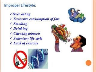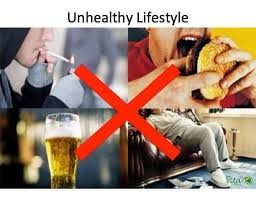 ಅನಾರೋಗ್ಯಕರ ಆಹಾರ ಸೇವನೆ ಅತಿಯಾಗಿ ತಿನ್ನುವುದು ಸಂಸ್ಕರಿಸಿದ ಆಹಾರಗಳು, ಶಕ್ತಿ ಪಾನೀಯಗಳು, ಕೃತಕ ಸಿಹಿಕಾರಕ ಗಳು ಮತ್ತು ತ್ವರಿತ ಆಹಾರಗಳ ಮೇಲೆ ಅತಿಯಾದ ಅವಲಂಬನೆ, ಜಡ ಜೀವನ, ಧೂಮಪಾನ, ಮದ್ಯಪಾನ ಮಾಡುವುದು, ಒತ್ತಡ, ಆಧುನಿಕ ಜೀವನ ಪದ್ಧತಿ ಎಂದು ಕರೆಯಲ್ಪಡುವ ಕಳಪೆ ನಿದ್ರೆಯ ಅಭ್ಯಾಸಗಳು ಮತ್ತು ನಗರೀಕರ ಣವು ಬದಲಾದ ಆಹಾರ ಪದ್ಧತಿಗಳೊಂದಿಗೆ ಸೇರಿಸಲ್ಪ ಟ್ಟಿದೆ. ಪರಿಸ್ಥಿತಿಯನ್ನು ಇನ್ನಷ್ಟು ಹದಗೆಡಿಸುತ್ತದೆ.