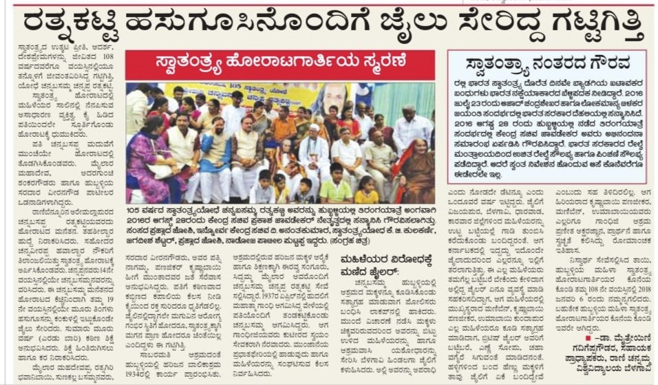 “ದೇಶಕ್ಕೆ ಸ್ವಾತಂತ್ರ್ಯ ಸಿಕ್ಕಿತು ಎಂಬ ಸುದ್ದಿ ಬಂದ ನಂತರ ಅಂದೇ ದಿನ ರಾತ್ರಿ12 ಘಂಟೆಗೆ ಜಿಲ್ಲಾಧಿಕಾರಿಗಳ ಕಛೇರಿಯ ಮೇಲೆ ತ್ರಿವರ್ಣ ಧ್ವಜ ಹಾರಿಸಲು ನಿರ್ಧರಿಸಿದರು. ಎಲ್ಲರಿಗೂ ಸಂದೇಶ ಮುಟ್ಟಿಸಿ ಜಿಲ್ಲಾಧಿಕಾರಿಗಳ ಕಛೇರಿ ಬಳಿ ಸೇರುವಂತೆ ತಿಳಿಸಲಾಯಿತು. ರಾತ್ರಿ ಧ್ವಜಾರೋಹಣ ಮಾಡಿ 21 ನೆಡುತೋಪು ಗಳನ್ನು ಹಾರಿಸಲಾಯಿತು. ಮಾರನೇಯ ದಿನ ಕಡಪಾ ಮೈದಾನದಲ್ಲಿ ಸ್ವಾತಂತ್ರ್ಯೋತ್ಸವದ ಆಚರಣೆಯನ್ನು ಇಟ್ಟುಕೊ ಳ್ಳಲಾಗಿತ್ತು. ಇಡೀ ಊರನ್ನೇ ತಳಿರು ತೋರಣಗಳಿಂದ ಸಿಂಗರಿಸ ಲಾಗಿತ್ತು.”ಕೋಟ್ಯಾನು ಕೋಟಿ ಭಾರತೀಯರ ಎದೆಯ ಕದ ತೆರೆಯಿತು. “ಬಿಳಿಯರ ಸರ್ಕಾರಕ್ಕೆ ಧಿಕ್ಕಾರ, ಬ್ರಿಟಿಷರೆ, ಭಾರತ ಬಿಟ್ಟುತೊಲಗಿರಿ, ಭಾರತ ಮಾತಾ ಕಿ ಜೈ, ಗಾಂಧಿ ಮಹಾತ್ಮಾ ಕಿ ಜೈ” ಎಂದು ಕಿವಿ ಗಡಚಿಕ್ಕುವಂತೆ ಘೋಷಣೆ ಗಳನ್ನು ಕೂಗುತ್ತ, ಓಣಿ ಓಣಿಗಳಲ್ಲಿ ಪ್ರಭಾತಫೇರಿಯನ್ನು ಮಾಡುತ್ತಿತ್ತು. ಅಂದಿನ ಪ್ರಭಾತಫೇರಿ ಹುಬ್ಬಳ್ಳಿ- ಧಾರವಾಡ ಜಿಲ್ಲೆಯ ಯುವಕರಲ್ಲಿ ಹೋರಾಟ ದ ಕೆಚ್ಚನ್ನು, ಸಾಮಾನ್ಯರಲ್ಲೂ ಸ್ವಾತಂತ್ರ್ಯ ಪ್ರಜ್ಞೆ ಯನ್ನು ಹೆಚ್ಚಿಸಿ, ಜಿಲ್ಲೆಯ ಸಮಸ್ತ ಜನರಲ್ಲಿ ರೋಮಾಂಚನಕಾರಿ ಅನುಭವದ ಮುದ್ರೆಯ ನ್ನು ಒತ್ತಿತ್ತು. ಒಬ್ಬೊಬ್ಬರದೂ ಒಂದೊಂದು ಹೋರಾಟದ ಕಥೆ. ಹೋರಾಟಕ್ಕೆ ಇಳಿದ ಪ್ರಸಂಗಗಳು ವಿಭಿನ್ನ. ಅವರ ಜೀವನದ ಪ್ರತಿ ಪುಟದಲ್ಲಿ ತ್ಯಾಗ, ಬಲಿದಾನದ ಹೇರಳ ಉದಾ ಹರಣೆಗಳು. ಆಸ್ತಿ- ಪಾಸ್ತಿ, ಕುಟುಂಬವನ್ನೇ ತೊರೆದು ಹೋರಾಟಕ್ಕೆ ಇಳಿದಿದ್ದರು.ಎಲ್ಲರಿಗೂ ಗಾಂಧೀಜಿಯೇ ಸ್ಪೂರ್ತಿ. ಇಂದಿಗೂ ಇವರಿಗೆ ಅವರು ನಡೆದ ಹಾದಿಯೇ ಜೀವನದ ದಾರಿ. ಕೆಚ್ಚಿನಿಂದ ಬ್ರಿಟಿಷರ ಬಂದೂಕಿನ ಗುಂಡುಗಳ ನ್ನು ಎದುರಿಸಿ, ಲಾಠಿ ಏಟುಗಳಿಗೂ ಹೆದರದೇ ಸೆರೆಮನೆ ಅನುಭವಿಸಿಯೂ ಸ್ವತಂತ್ರ ಭಾರತದ ಹೊಂಗನಸನ್ನು ಸಾಕಾರಗೊಳಿಸಿದ ದಿ.ಪದ್ಮಶ್ರೀ ಸರದಾರ ವೀರನಗೌಡ ಪಾಟೀಲ, ದಿ.ನರಸಿಂಹ ದಾಬಡೆ, ಶ್ರೀಎಸ್.ವಿ. ಟೇಂಬೆ, ಶ್ರೀಮತಿ. ಲೀಲಾವತಿ ಮಾಗಡಿ, ದಿ .ಮಲ್ಲಪ್ಪ ಅಕ್ಕಿ, ದಿ.ಡಾ.ನಾರಾಯಣ್ ಸುಬ್ಬರಾವ್ ಹರ್ಡಿಕರ್, ಶ್ರೀ ವೆಂಕಟೇಶ ಮಾಗಡಿ, ದಿ.ಮುಗಳಿ, ದಿ.ಶಿರೂರ, ದಿ.ಶಿವಪ್ಪ ಫಕೀರಪ್ಪ ಕೋರ್ಲಹಳ್ಳಿ, ದಿ.ಕಮರಕರ, ದಿ.ರಾಯರೆಡ್ಡಿ, ಹಿರೇಗೌಡರ, ದಿ.ಗಾಣಿಗೇರ, ದಿ.ಹಿತ್ತಲಮನಿ, ದಿ.ಗುರಪ್ಪ ಅರ್ಕಸಾಲಿ, ದಿ.ಬಳಿಗೇರ ಹೀಗೆ ಇನ್ನೂ ಅನೇಕ ಸ್ವಾತಂತ್ರ್ಯ ಯೋಧರು ಈ ಜಿಲ್ಲೆಯಲ್ಲಿ ಹೋರಾಡಿರುತ್ತಾರೆ. ಇವರೆಲ್ಲರ ಸಾಲಿಗೆ ಸೇರುವ ಹೋರಾಟಗಾರ್ತಿ ಶ್ರೀಮತಿ. ಚನ್ನಬಸಮ್ಮ ಚನ್ನಪ್ಪ ರತ್ನಕಟ್ಟಿಯವರು ಎಲ್ಲವನ್ನೂ ನೆನಪಿಸಿಕೊಳ್ಳುತ್ತಾರೆ.