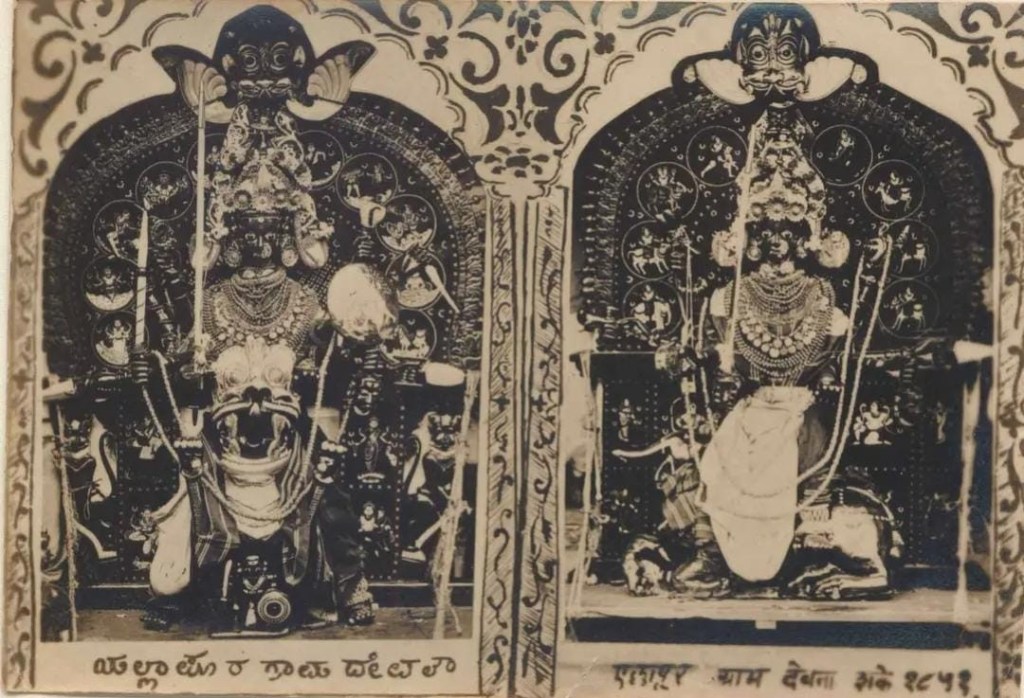 ಸರಿ ಸುಮಾರು ೬೦೦ ವರ್ಷಗಳ ಹಿಂದೆ ಯಲ್ಲಾ ಪುರ ತಾಲೂಕಿನ ಹಿಂದುಳಿದ ಗ್ರಾಮ ವಾದ ‘ನಾರಾಯಣಗೆರೆ’ ಎನ್ನುವಲ್ಲಿ ಒಬ್ಬ ಶೂದ್ರನಿಗೆ ಹೊಲದ ಕೆಲಸವನ್ನು ಮಾಡುತ್ತಿರು ವಾಗ ಸವಕಲು ಪ್ರತಿಮೆಗಳು ಸಿಕ್ಕಿದ್ದವು. ಅದನ್ನು ನವೀಕರಿಸಿ ‘ಶಿವಣಿ’ ಕಟ್ಟಿಗೆಯಿಂದ ಎರಡು ಮರದ ಪ್ರತಿಮೆಗಳನ್ನು ಹೊಸದಾಗಿ ಮಾಡಲ್ಪ ಟ್ಟಿತು. ಆಕಾಶಬಣ್ಣದ ಪ್ರತಿಮೆ ‘ಕಾಳಮ್ಮ’, ಅದರ ವಾಹನ ‘ಕೋಣ’! ಕೆಂಪು ಬಣ್ಣದ ಪ್ರತಿಮೆ ‘ದುರ್ಗಮ್ಮ’, ಅದರ ವಾಹನ ‘ಸಿಂಹ’.