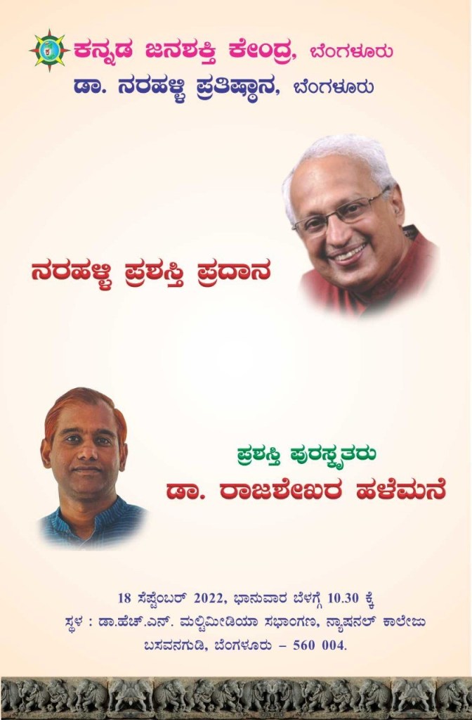 ದಿನಾಂಕ : ೧೮ -೯- ೨೦೨೨ ರ ಭಾನುವಾರ ಬೆಂಗಳೂರಿನ ನ್ಯಾಷನಲ್ ಕಾಲೇಜಿನಲ್ಲಿ, ಕನ್ನಡ ಜನಶಕ್ತಿಕೇಂದ್ರ ಮತ್ತು ಡಾ.ನರಹಳ್ಳಿ ಪ್ರತಿಷ್ಠಾನ ಆಯೋಜಿಸಿದ್ದ ನರಹಳ್ಳಿ ಪ್ರಶಸ್ತಿ ಪ್ರದಾನ ಸಮಾರಂಭದಲ್ಲಿ ಹಿರಿಯ ಪತ್ರಕರ್ತ ರಾದ ಶ್ರೀ ಜಿ. ಎನ್. ರಂಗನಾಥ ರಾವ್ ರವರು ಡಾ. ರಾಜ ಶೇಖರ ಹಳೆಮನೆ ಅವರಿಗೆ ನರಹಳ್ಳಿ ಪ್ರಶಸ್ತಿ ಪ್ರದಾನ ಮಾಡಿ ಡಾ. ನರಹಳ್ಳಿ ಬಾಲಸುಬ್ರಹ್ಮಣ್ಯ ಅವರ ಬದುಕು ಬರಹದ ಬಗ್ಗೆ ಮಾತನಾಡಿದರು.