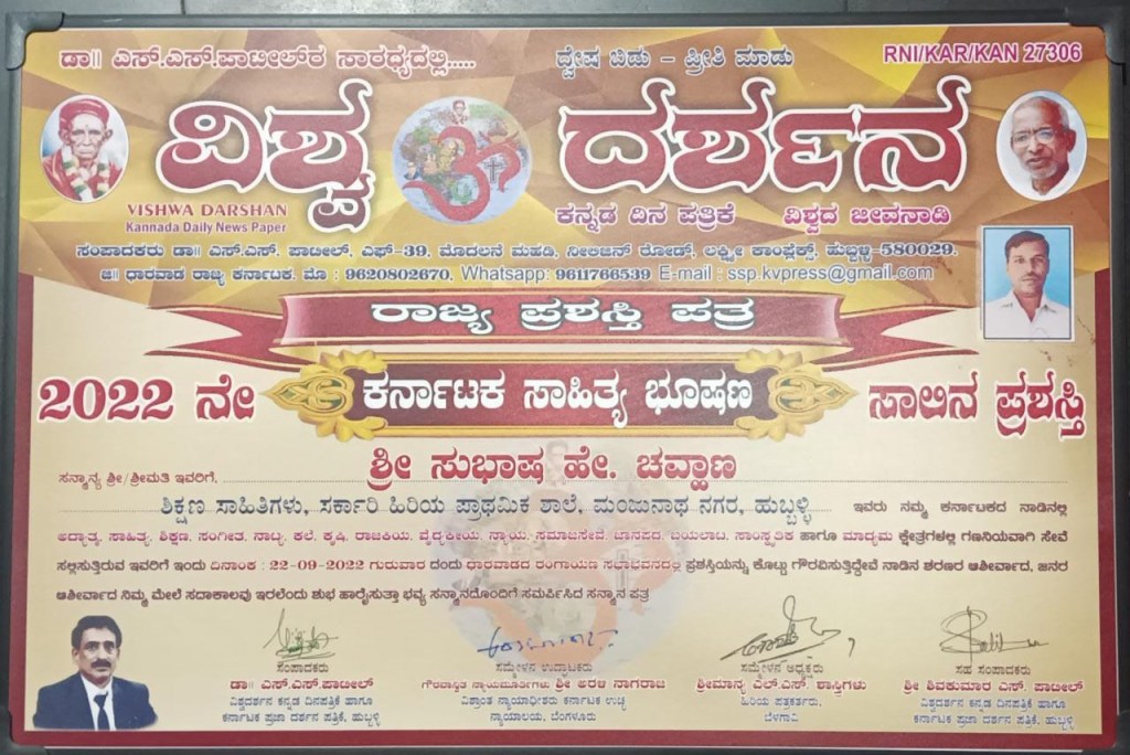 ೨೪ ವರ್ಷಗಳಿಂದ ಕನ್ನಡ ಸಾರಸ್ವತ ಲೋಕದಲ್ಲಿ ಸಾಮರಸ್ಯ ಸಂದೇಶವುಳ್ಳ ಕಥೆ, ಕವನ, ವೈಚಾರಿಕ ಲೇಖನ ಬರಹ ಮತ್ತು ಪ್ರಗತಿಪರ ವಿಚಾರಧಾರೆ ಚಿಂತನೆ ಮೂಲಕ ಭಾವೈಕ್ಯ ಸಮಾಜ ನಿರ್ಮಾಣದಲ್ಲಿ ನಿರತರಾಗಿರುವ ‘ಸುಹೇಚ‘ ಕಾವ್ಯನಾಮದ ಶಿಕ್ಷಕ ಸಾಹಿತಿಗಳಾದ ಸುಭಾಷ್ ಹೇಮಣ್ಣಾ ಚವ್ಹಾಣ ಇವರ ಅಮೂಲಾಗ್ರ ಸಾಹಿತ್ಯ ಸೇವೆಯನ್ನು ಗುರುತಿಸಿ ‘ವಿಶ್ವ ದರ್ಶನ’ ದಿನಪತ್ರಿಕೆಯು ೨೦೨೨ ನೇ ಸಾಲಿನ ‘ಕರ್ನಾಟಕ ಸಾಹಿತ್ಯ ಭೂಷಣ’ ರಾಜ್ಯ ಪ್ರಶಸ್ತಿ ಪ್ರದಾನ ಮಾಡಲಾಯಿತು.