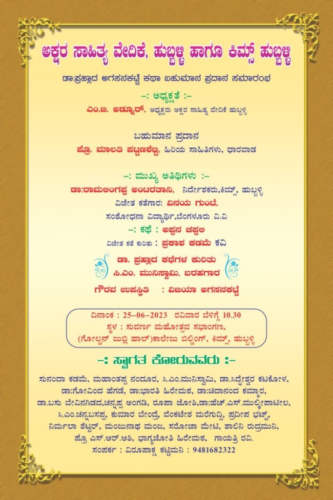 ದಿ:26/06/2023 ರಂದು ಹುಬ್ಬಳ್ಳಿ ನಗರದ ಕಿಮ್ಸ್ ಆಸ್ಪತ್ರೆಯ ಸುವರ್ಣ ಮಹೋತ್ಸವ ಸಭಾಂಗಣದಲ್ಲಿ ಅಕ್ಷರಸಾಹಿತ್ಯ ವೇದಿಕೆ, ಹುಬ್ಬಳ್ಳಿ ಹಾಗೂ ಕಿಮ್ಸ್, ಹುಬ್ಬಳ್ಳಿ ಇವರು ಆಯೋಜಿಸಿದ್ದ ‘ಡಾ. ಪ್ರಹ್ಲಾದ ಅಗಸನಕಟ್ಟೆ ವಿದ್ಯಾರ್ಥಿ ಕಥಾ ಪ್ರಶಸ್ತಿ ಪ್ರದಾನ ಸಮಾರಂಭ‘ ದಲ್ಲಿ ಅವರು ಮಾತನಾಡಿದರು.