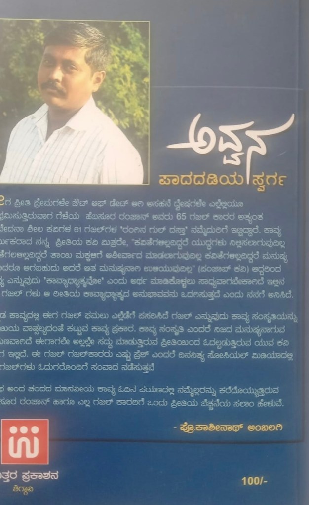 ಗಜಲ್ ಕಾರರು ಅವರರವರ ಅವ್ವನಿಗೆ ಒಂದೊಂದು ಗಜಲ್ ಪುಷ್ಪಗಳನ್ನು ಪಾದಕ್ಕೆ ಅರ್ಪಿಸಲು ಬಂದಾಗ ಹೆಬಸೂರ ರಂಜಾನ್ ರವರು, ತಮ್ಮ ಸಂಪಾದಕದಾರದಿಂದ ಪೋಣಿಸಿ ಅವ್ವನ ಪಾದದಡಿಯ ಸ್ವರ್ಗದ ಹೊಸ್ತಿಲು ಮೇಲಿಟ್ಟು ರಸಿಕ ಭಾವದ ವಾಚಕರನ್ನು ಹೊಸ ಸ್ವರ್ಗಕ್ಕೆ ಸ್ವಾಗತಿಸಿದ್ದಾರೆ.