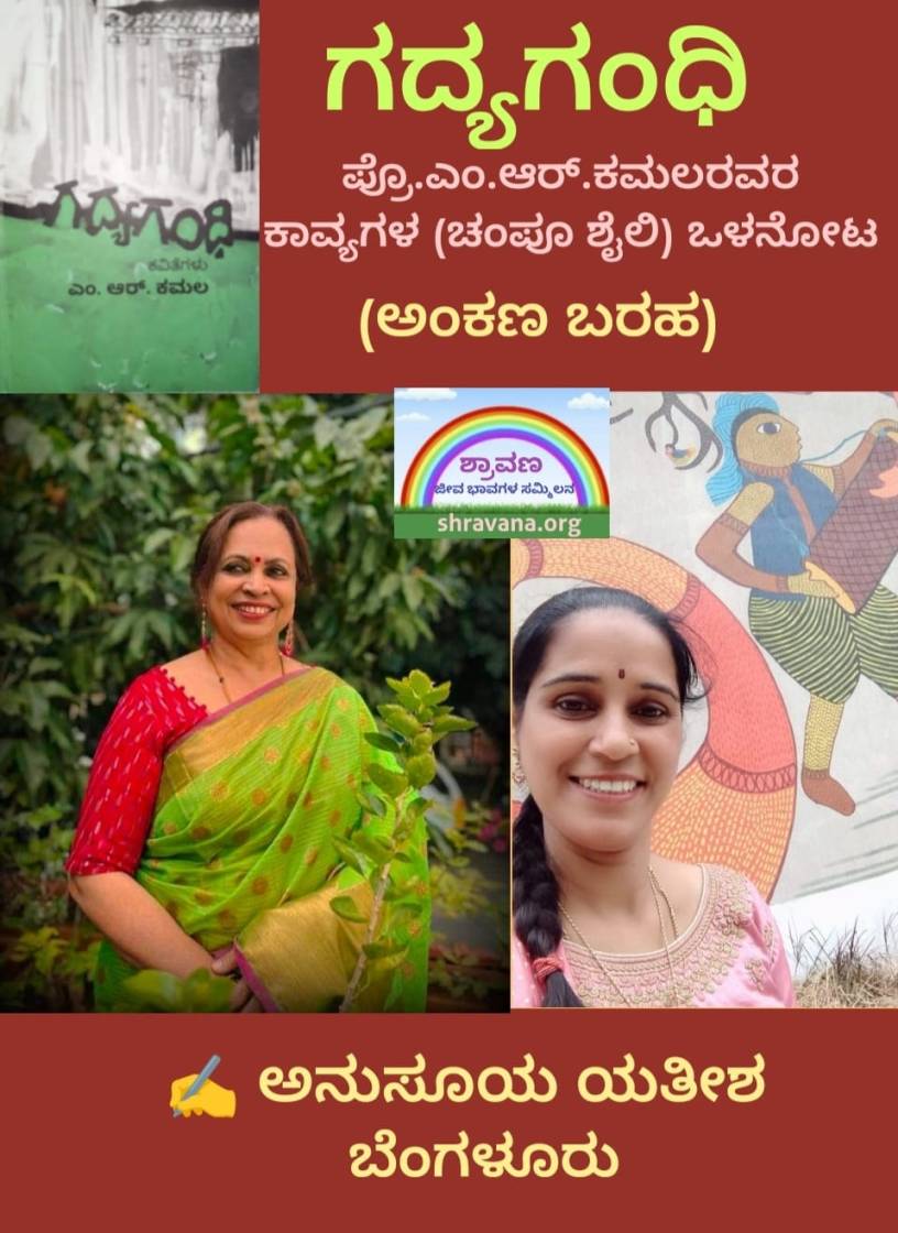ಇಷ್ಟೆಲ್ಲ ಸಾಧನೆ ಮಾಡಿರುವಂತಹ ಎಂ.ಆರ್. ಕಮಲ ಅವರ “ಗದ್ಯಗಂದಿ” ಕವಿತೆಗಳು ನನ್ನನ್ನ ಬಹಳಷ್ಟು ಕಾಡಿದವು. ಇವರು ಮುಖಪುಟದಲ್ಲಿ ಪ್ರಕಟಿಸಿದ ಗದ್ಯಗಂಧಿ ಕವಿತೆಯೊಂದನ್ನು ನೋಡಿ ದಾಗ ನನಗೆ ಮತ್ತೆ ಮತ್ತೆ ಓದಬೇಕೆನಿಸಿತು. ಇದು ಇತರ ಅವರ ಬರಹಗಳಿಗಿಂತ ವಿಭಿನ್ನ ಎನಿಸಿತು. ತಕ್ಷಣ ನಾನು ಅವರೊಂದಿಗೆ ಈ ವಿಚಾರಗಳ ಬಗ್ಗೆ ಚರ್ಚಿಸಿದಾಗ ‘ಗದ್ಯಗಂಧಿ’ ಮತ್ತು ‘ನೆಲದಾಸೆಯ ನಕ್ಷತ್ರಗಳು’ ಎಂಬ ಎರಡು ಕೃತಿಗಳು ಇದೇ ಪ್ರಕಾರ ದಲ್ಲಿ ಇರುವುದಾಗಿ ತಿಳಿಸಿದರು. ಇವುಗಳಲ್ಲಿ ವಿಶೇಷವಾದ ಅನೇಕ ಅಂಶಗಳು ಕಂಡುಬಂದವು. ಬಹುಶ ಈ ಪದ್ಯಗಳಲ್ಲಿ ಬಳಸಿರುವ ರೂಪಗಳು ಅಷ್ಟೇ ಪ್ರಧಾನ್ಯತೆ ಪಡೆದಿದ್ದವು ಎನಿಸುತ್ತದೆ. ಪ್ರತಿ ಸಾಲು, ಆಲೋಚನೆ, ವಿಚಾರಗಳಿಗೂ ಅವರು ಬಳಸಿರುವ ಮೆಟಾಫರ್ ಗಳು ಅವುಗಳ ಬಗ್ಗೆ ಹೆಚ್ಚಿನ ಕುತೂಹಲ ಮೂಡಿಸಿದವು. ಇಲ್ಲಿ ಕವಯಿತ್ರಿ ವರ್ತಮಾನದ ತಲ್ಲಣಗಳನ್ನು, ಸಂಕಟ ಗಳನ್ನು ಹಿಡಿದಿಡುವಲ್ಲಿ ಉತ್ಕಟವಾದ ಸಂವೇದನೆ ಗಳನ್ನು ಪ್ರಕಟಿಸಲು ರೂಪಕಗಳ ಮೊರೆ ಹೋಗಿ ದ್ದಾರೆ. ಎಲ್ಲಕ್ಕಿಂತ ಹೆಚ್ಚಿನದೆಂದರೆ
