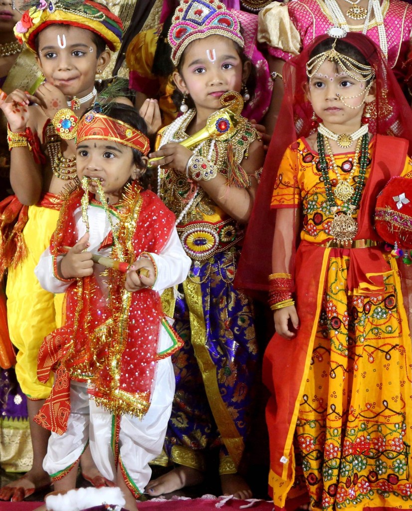 ಪುಟ್ಟ ಮಕ್ಕಳಿಗೆ ತಾಯಂದಿರು ಕೃಷ್ಣ ಮತ್ತು ರಾಧೆಯರ ವೇಷ ಹಾಕುವ ಮೂಲಕ ಬಾಲಕೃಷ್ಣ ರಾಧೆಯನ್ನು ಅವರ ರೂಪದಲ್ಲಿ ಕಂಡು ಸಂಭ್ರಮಿ ಸುವುದಲ್ಲದೇ ಅವರು ಅಳದಿರಲೆಂದು ಬಾಯಿಗೆ ಬೆಣ್ಣೆ ಒರೆಸುವರು. ಇದು ಮಕ್ಕಳಿಗೆ ಬೆಣ್ಣೆ ತಿನ್ನಿಸುವ ಕ್ರಿಯೆಯು ಕೂಡ. ಶಾಲೆಗಳಲ್ಲಿ ಶ್ರೀಕೃಷ್ಣ ರಾಧೆಯರ ವೇಷಭೂಷಣ ಸ್ಪರ್ಧೆ ಈ ದಿನ ಜರುಗುತ್ತದೆ. ಉತ್ತಮ ವೇಷಭೂಷಣ ಹೊಂದಿದ ಮಕ್ಕಳಿಗೆ ಪ್ರಥಮ, ದ್ವಿತೀಯ ಹಾಗೂ ತೃತೀಯ ಬಹುಮಾನಗಳನ್ನು ಕೂಡ ನೀಡುವ ಮೂಲಕ ಕೃಷ್ಣನನ್ನು ಸ್ಮರಿಸುವ ಈ ದಿನ ನಾಡಿಗೆಲ್ಲ ಮಹತ್ವದ್ದಾಗಿದೆ. ಶ್ರೀ ಕೃಷ್ಣನ ಸ್ಮರಣೆಗಾಗಿ ವಿಷ್ಣು ಸಹಸ್ರನಾಮ, ಭಗವದ್ಗೀತೆಗಳನ್ನು ಪಠಿಸುವ ಜೊತೆಗೆ ಅದರ ತಿರುಳನ್ನು ಹತ್ತು ಜನಕ್ಕೆ ತಿಳಿಸುವ ಮೂಲಕ ಶ್ರೀ ಕೃಷ್ಣನನ್ನು ಪೂಜಿಸುವುದು ಹಿರಿಯ ರು ವಯಸ್ಕರು ಮಾಡುವ ಕರ್ತವ್ಯಗಳಲ್ಲೊಂದಾ ಗಿದೆ. ಈ ದಿನ ವಿವಾಹಿತ ಸ್ತ್ರೀಯರು ಉಪವಾಸ ಮಾಡುವ ಮೂಲಕ ಕೃಷ್ಣ ಜನ್ಮಾಷ್ಟಮಿ ಆಚರಣೆ ಯಲ್ಲಿ ತಮ್ಮನ್ನು ತೊಡಗಿಸಿಕೊಳ್ಳುವರು.