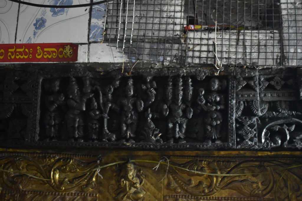 ಶಿವ ಪಾರ್ವತಿಯರ ಜೊತೆಯಲ್ಲಿ ಬ್ರಹ್ಮ ಇದ್ದು ಮಹರ್ಷಿಗಳು ದಾರೆ ಸಮಾರಂಭಕ್ಕೆ ಸಾಕ್ಷಿಯಾ ದಂತೆ ಕೆತ್ತನೆ ಇದೆ. ಚತುರ್ಭುಜಧಾರಿಯಾದ ಶಿವನ ಕೈಗಳಲ್ಲಿ ಡಮರುಗ, ಮೃಗ, ವರದ ಮತ್ತು ಪಾರ್ವತಿಯ ಕೈಯನ್ನು ಹಿಡಿದಿದ್ದು ದ್ವಾರ ಉಳಿದ ಭಾಗಗಳು ಹೂಬಳ್ಳಿಗಳೂ ಆವರಸಿಕೊಂಡಿದೆ. ದ್ವಾರದ ಇಕ್ಕೆಲಗಳಲ್ಲಿ ಗಿರಿಜಾ ಕಲ್ಯಾಣ ಇತರ ಕೆತ್ತನೆಗಳು ಇದ್ದು, ಇದರಲ್ಲಿ ಸ್ತ್ರೀ ಮಗುವನ್ನು ಸೊಂಟದ ಮೇಲೆ ಕೂರಿಸಿಕೊಂಡಿರುವಂತೆ ಇದ್ದು ಸ್ಥಳೀಯವಾಗಿ ಪಾರ್ವತಿಯ ಶಿಲ್ಪ ಎಂದು ಕರೆಯುತ್ತಾರೆ. ಮಕ್ಕಳಿಲ್ಲದವರು ಈ ಶಿಲ್ಪಕ್ಕೆ ಹರಕೆ ಹೊತ್ತರೆ ಮಕ್ಕಳಾಗುವುದು ಎಂಬ ನಂಬಿಕೆ ಇದೆ. ದ್ವಾರದ ಭಾಗವನ್ನು ಹೊರಗೆ ಇರಿಸಲಾಗಿದ್ದು, ಗಿರಿಜಾ ಕಲ್ಯಾಣದ ಕೆತ್ತನೆಗಳ ಮುಂದುವರೆದ ಭಾಗ ಇಲ್ಲಿದೆ.