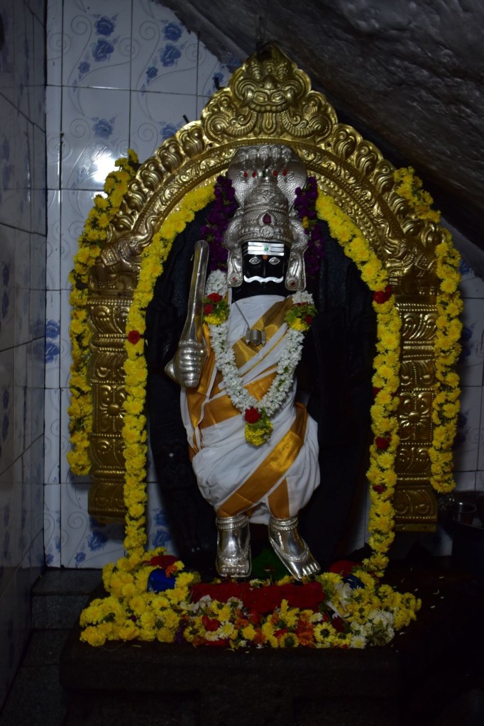 ಬೆಟ್ಟದ ಮೇಲಿರುವ ಈ ದೇವಾಲಯ ಗುಹಾಂತರ ಸ್ವರೂಪದಲ್ಲಿದೆ. ಗರ್ಭಗುಡಿ ನವರಂಗ ಮತ್ತು ಅಂಕಣ ಹೊಂದಿದ್ದು ಗರ್ಭಗುಡಿಯಲ್ಲಿ ಕಮಲ ಪೀಠದ ಮೇಲೆ ಸುಮಾರು 12ನೇ ಶತ ಮಾನದ ನಾಲ್ಕು ಅಡಿ ಎತ್ತರದ ಸ್ಥಾನಿಕ ಸೌಮ್ಯ ಸ್ವರೂಪಿ ಯಾದ ವೀರಭದ್ರನ ಶಿಲ್ಪವಿದೆ. ಗರ್ಭ ಗುಡಿ ಬಂಡೆಯೊಂದರ ಕೆಳಗೆ ಇದ್ದು, ಪ್ರವೇಶ ದ್ವಾರದಲ್ಲಿ ಮರದಲ್ಲಿ ನಿರ್ಮಿಸದ ಬಾಗಿಲುವಾಡ ಇದೆ. ಲಲಾಟದಲ್ಲಿ ಗಿರಿಜಾ ಕಲ್ಯಾಣದ ಕೆತ್ತನೆ ಇದೆ.