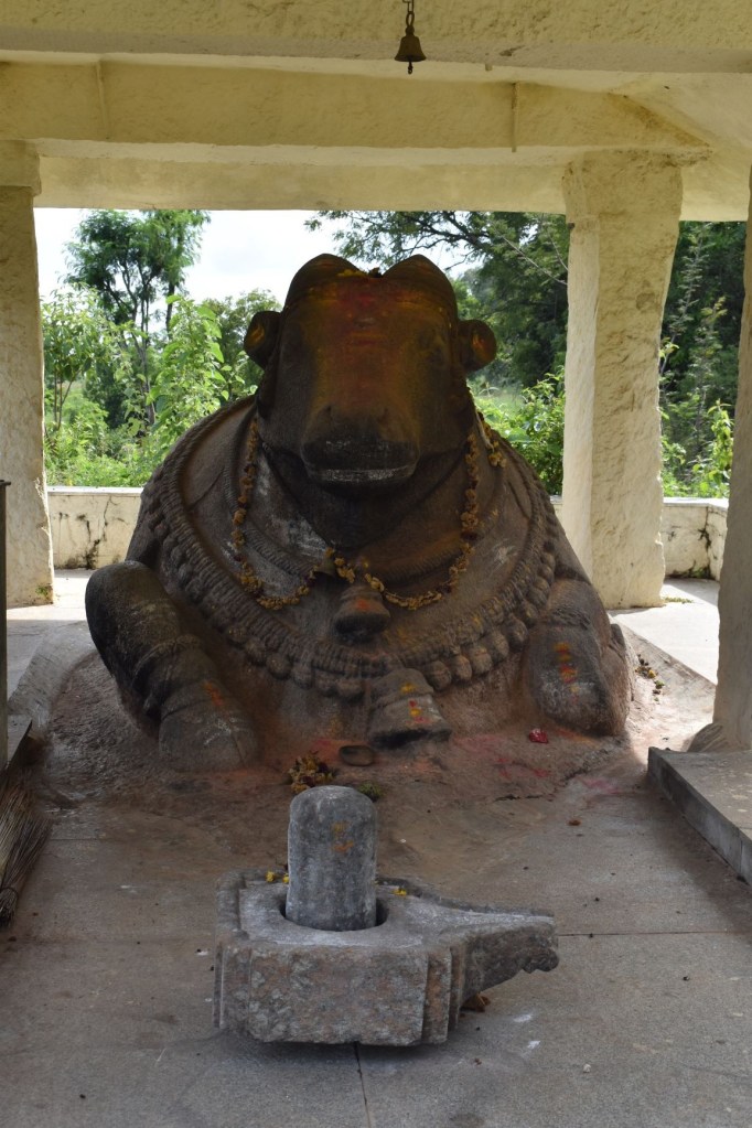 ಸ್ವಲ್ಪಮುಂದೆ ಸಾಗಿದಲ್ಲಿ ಮಂಟಪದಲ್ಲಿ ಬೃಹತ್ತಾದ ನಂದಿಯಿದ್ದು ಸುಮಾರು ಐದು ಅಡಿ ಎತ್ತರವಿದೆ. ನಂದಿಯಲ್ಲಿನ ಕೊರಳ ಹಾರಗಳು,ಘಂಟೆ,ಕಾಲಿನ ಗೆಜ್ಜೆ ಸರಗಳು ಕಲಾತ್ಮಕವಾಗಿದೆ. ಎದುರು ಭಾಗ ದಲ್ಲಿ ಸಮಿಪದಲ್ಲಿ ಸಿಕ್ಕ ಶಿವಲಿಂಗ ಇರಿಸಲಾಗಿದೆ.