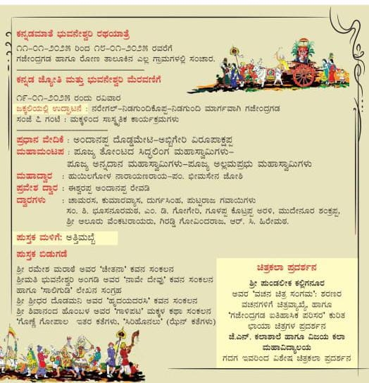 ಕನ್ನಡ ಮಾತೆ ಭುವನೇಶ್ವರಿ ರಥಯಾತ್ರೆ ಕನ್ನಡ ಜ್ಯೋತಿ ಮೆರವಣಿಗೆ ಗಜೇಂದ್ರಗಡ ಹಾಗೂ ರೋಣ ತಾಲೂಕಿನ ಎಲ್ಲ ಗ್ರಾಮಗಳಲ್ಲಿ ಸಂಚರಿಸಿ, ಜಕ್ಕಲಿ ಯಲ್ಲಿ ಉದ್ಘಾಟನೆ :ನರೇಗಲ್-ನಿಡಗುಂದಿ ಕೊಪ್ಪ -ನಿಡಗುಂದಿ ಮಾರ್ಗವಾಗಿ ಗಜೇಂದ್ರಗಡಕ್ಕೆ ಆಗಮಿಸಿ ಸಂಜೆ ೭ ಗಂಟೆ :ಮಕ್ಕಳಿಂದ ಸಾಸ್ಕೃತಿಕ ಕಾರ್ಯಕ್ರಮಗಳು ನೆರವೆರಿದವು. ಪ್ರಧಾನ ವೇದಿಕೆ : ಅಂದಾನಪ್ಪ ದೊಡ್ಡಮೇಟಿ – ಅಬ್ಬಿಗೇರಿ ವಿರೂಪಾಕ್ಷಪ್ಪ ಮಹಾಮಂಟಪ : ಪೂಜ್ಯ ತೋಂಟದ ಸಿದ್ದಲಿಂಗ ಮಹಾಸ್ವಾಮಿಗಳು – ಪೂಜ್ಯ ಅನ್ನದಾನ ಮಹಾಸ್ವಾಮಿಗಳು – ಪೂಜ್ಯ ಅಲ್ಲಮಪ್ರಭು ಮಹಾಸ್ವಾಮಿಗಳು, ಮಹಾದ್ವಾರ : ಹುಯಿಲಗೋಳ ನಾರಾಯಣರಾಯ- ಪಂ. ಭೀಮಸೇನ ಜೋಶಿ, ಪ್ರವೇಶ ದ್ವಾರ : ಈಶ್ವರಪ್ಪ ಅಂದಾನಪ್ಪ ರೇವಡಿ, ದ್ವಾರಗಳು : ಚಾಮರಸ, ಕುಮಾರವ್ಯಾಸ, ದುರ್ಗಸಿಂಹ, ಪುಟ್ಟರಾಜ ಗವಾಯಿಗಳು ಸಂ.ಶಿ.ಭೂಸನೂರಮಠ, ಎಂ. ಡಿ. ಗೋಗೇರಿ, ಗೂಳಪ್ಪ ಕೊಟ್ರಪ್ಪ ಅರಳಿ, ಮುದೇನೂರ ಶಂಕ್ರಪ್ಪ, ಶ್ರೀ ಆಲೂರು ವೆಂಕಟರಾಯರು, ಗಿರಡ್ಡಿ ಗೋವಿಂದರಾಜ, ಆರ್. ಸಿ. ಹಿರೇಮಠ.